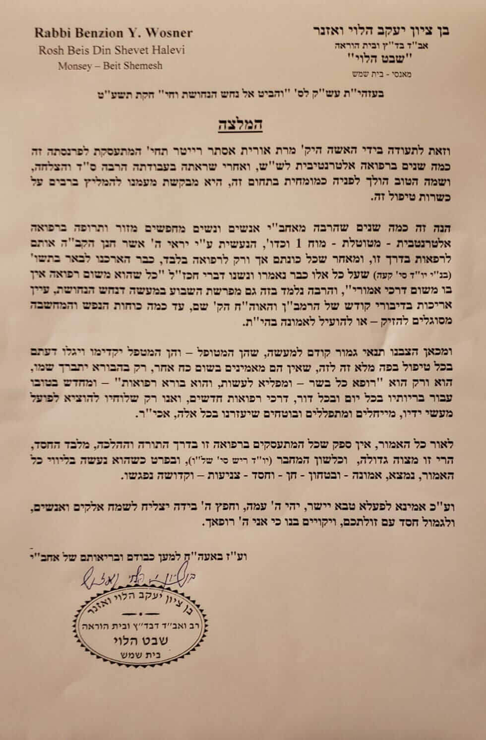 This is to be a certificate in the hands of the honorable, Mrs. Orit Esther Ritter, may she live long. She has been involved in this profession, ”Alternative Medicine,” for many years and for the sake of Heaven. After she has seen much Heavenly help and success, and has a reputation as an expert in this field, she has requested a recommendation regarding the halachic validity of this treatment.